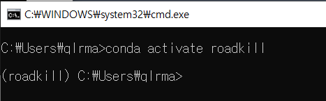 이제 가상환경을 실행해보겠습니다. "conda activate <가상환경이름>" ex)conda activate roadkill