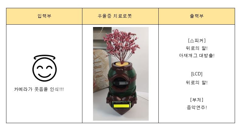 “웃으면 복이 온다” 라는 격언이 있습니다. 행복해지는 가장 첫 단계는 웃는 것이라고 생각해요. 그래서 우리 로봇은 ‘억지 미소’에 작동하도록 설계되었습니다. 우울한 사용자가 로봇에 억지 미소를 지어주면, 음성(우리의 녹음된 목소리, 아재개그), 텍스트 메시지(힘내세요, 웃어주세요)가 출력되어 그 ‘억지 미소’를 ‘진짜 웃음’으로 바꾸어줍니다. 우리의 로봇은 미소 짓는 자에게 진정한 웃음을 선사할 것입니다.