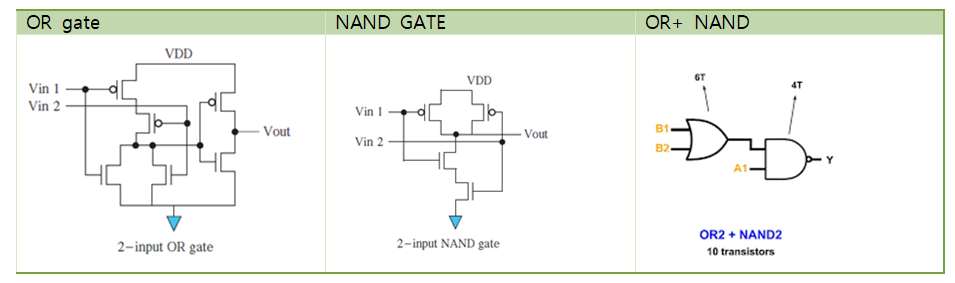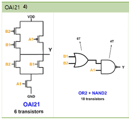 결론) 기술매핑(Technology mapping)을 통해, 우리는 MOSFET의 개수를 절약할 수 있습니다. 아래에서 볼 수 있듯이, OAI21은 6개의 MOSFET으로 구성되는데에 반해, OR+NAND는 10개의 MOSFET으로 구성됩니다. 이렇게되면, 60%로 MOSFET 개수가 줄어들겠죠?