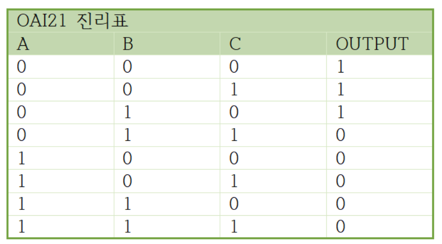 OAI21은 OR, NAND 게이트 조합과 동일하게 동작됩니다. 3개의 PMOS와 3개의 NMOS로 구성됩니다. 아래 진리표로 동작합니다.