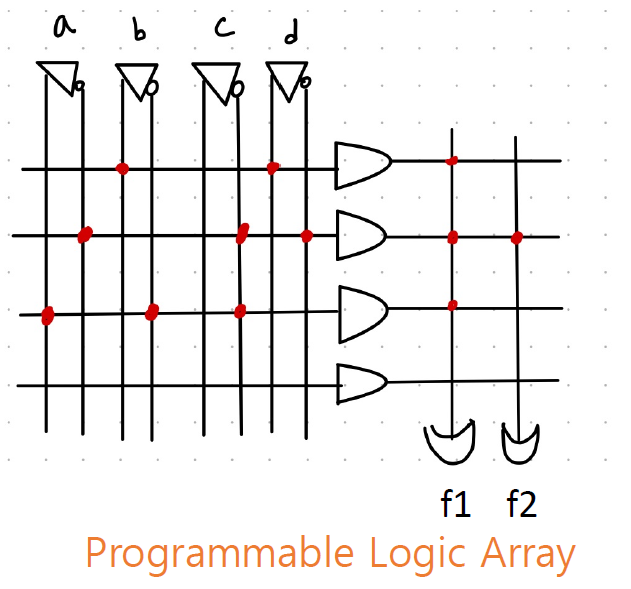 논리 최소화는 힘들지만, 설계가 간단해서, 많이 사용하곤 합니다. 곱의 합 형태로 나타내면 됩니다. OR gate plane이 fixed 되었다는 차이점을 가집니다.