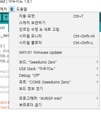 2단계) 보드 매니저 추가하기. 툴 -> 보드 -> 보드매니저에서 Seeeduino Zero를 선택하고 다운로드