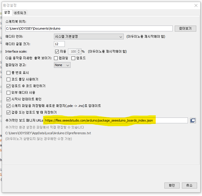 1단계) 파일 - 환경설정 추가적인 보드매니저 추가하기 아래 URL을 보드매니저에 추가해줍니다.