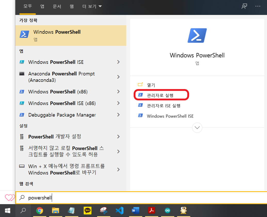 1단계) 윈도우 아래 검색창에서 PowerShell을 관리자로 실행시켜주세요.