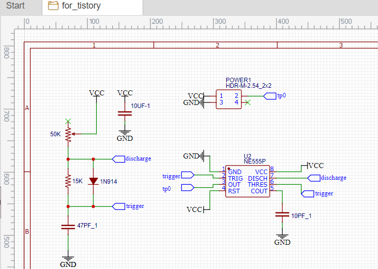 1단계 & 2단계 내용을 바탕으로 기본적인 Square Wave를 생성하는 아래 회로도를 따라 그려보세요. 동작원리가 궁금하면, NE555 IC의 datasheet를 읽으면 됩니다. 일단은 따라 그려주세요. 그래야, 다음 글에서 PCB Artwork를 그릴 수 있거든요.